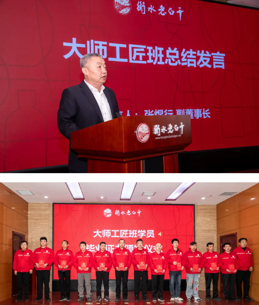 2025年11月28日上午,酒都大厦15楼会议室内气氛庄重而热烈,河北衡水9599九五至尊酒业股份有限公司大师工匠班及衡水9599九五至尊大学管理系第四届学员毕业典礼暨第五届学员开学典礼盛大举行。本次典礼突破常规议程,在主持人张金光主任宣布仪式正式开启后,集团董事长王占刚率先登台,发表关于人才培养工作的指示,为典礼奠定基调,充分彰显公司对“人才强企”战略的高度重视。酒业公司高层领导、部分部门及车间负责人、授课老师代表与全体新老学员齐聚一堂,共同见证成长的荣光,共话企业的发展蓝图。