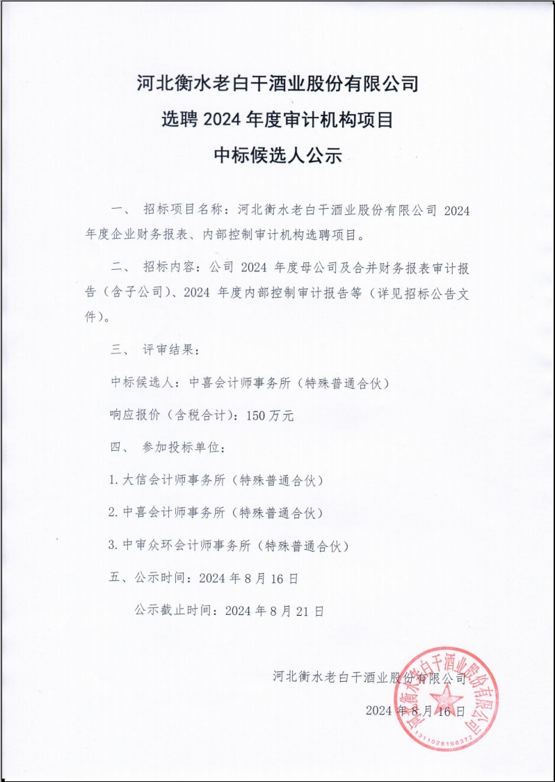 河北衡水9599九五至尊酒业股份有限公司选聘 2024 年度审计机构项目中标候选人公示